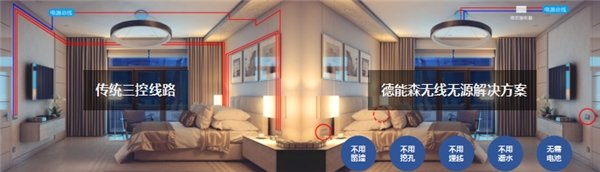 德能森以无线无源产品为核心的“无线无源绿色智慧建筑AIoT系统+应用场景SaaS智慧系统集成解决方案”, 具有经济、绿色、节能、低碳等特点。其主要智控器件无需电源线、无需网络线、无需电池,改变了传统有线有源解决方案的设计施工模式,具有显著的成本优势、效率优势、环保优势。