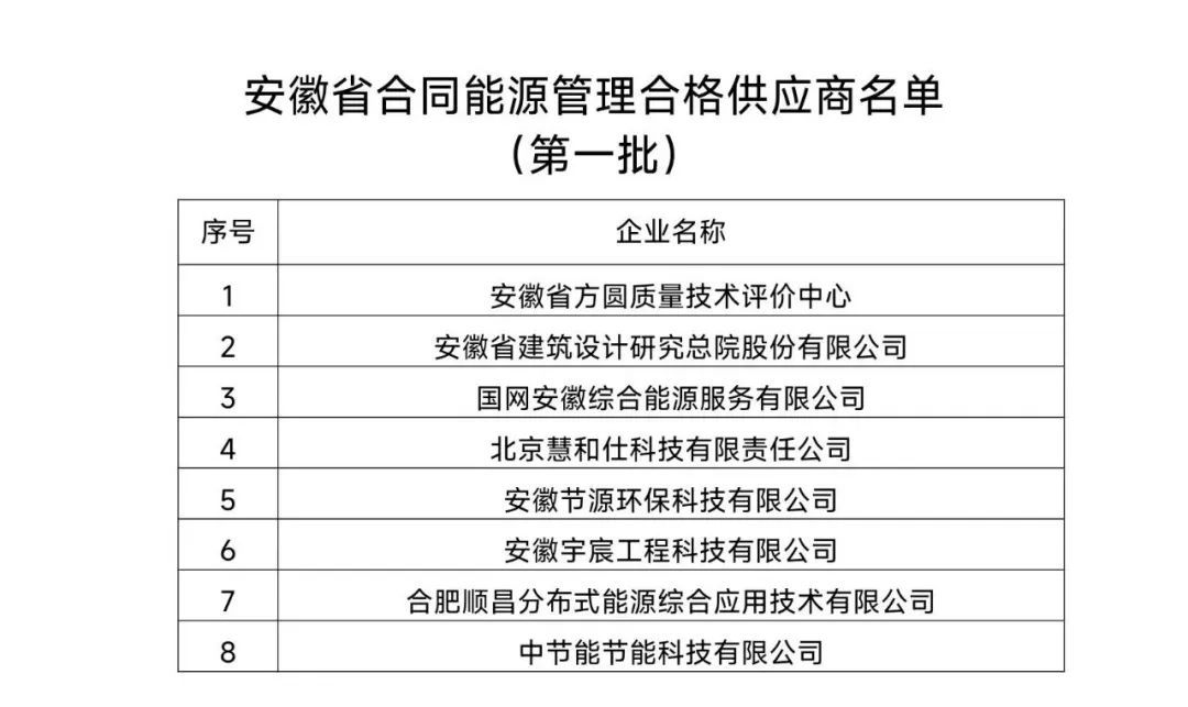 记者从安徽省发展和改革委员会获悉,根据《安徽省发展改革委关于征集安徽省节能减煤降碳诊断服务机构和合同能源管理合格供应商的通知》要求,经专家评审,现将安徽省节能减煤降碳诊断服务机构名单(第一批)和合同能源管理合格供应商名单(第一批)予以公示。