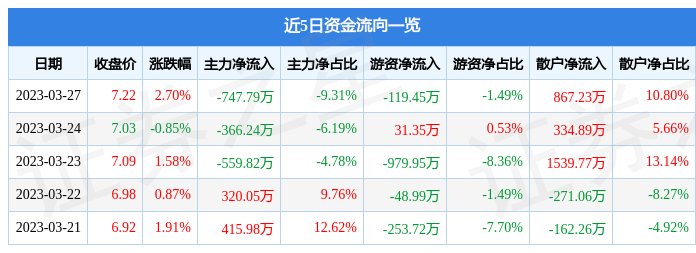 3月27日的资金流向数据方面,主力资金净流出747.79万元,占总成交额9.31%,游资资金净流出119.45万元,占总成交额1.49%,散户资金净流入867.23万元,占总成交额10.8%。