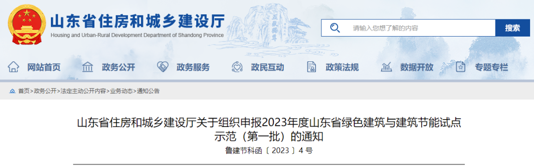 山东省住房和城乡建设厅关于组织申报2023年度山东省绿色建筑与建筑节能试点示范(第一批)的通知
