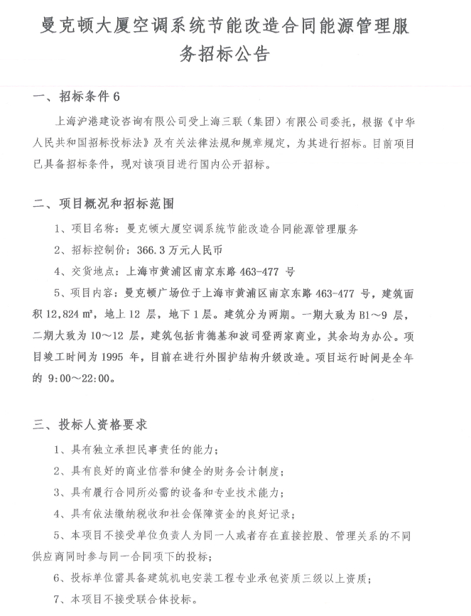 11月14日,曼可顿大厦空调系统节能改造合同能源管理服务招标公告发布,预算金额366.3万元。