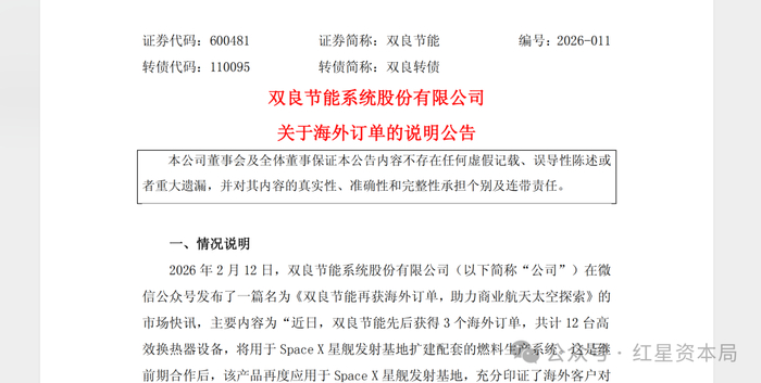 红星资本局注意到,公众号内容发布后,双良节能再次发布关于海外订单的说明公告,公告称,公司本次3项订单分别签订于2025年10月25日和2026年1月9日,供货标的为高效换热器,合计总金额约170万欧元(以1欧元≈8.19元人民币的汇率换算,订单总金额约为人民币1392.30万元),订单总金额占公司2024年度经审计的营业收入的比例约为0.11%,对公司经营业绩无重大影响。